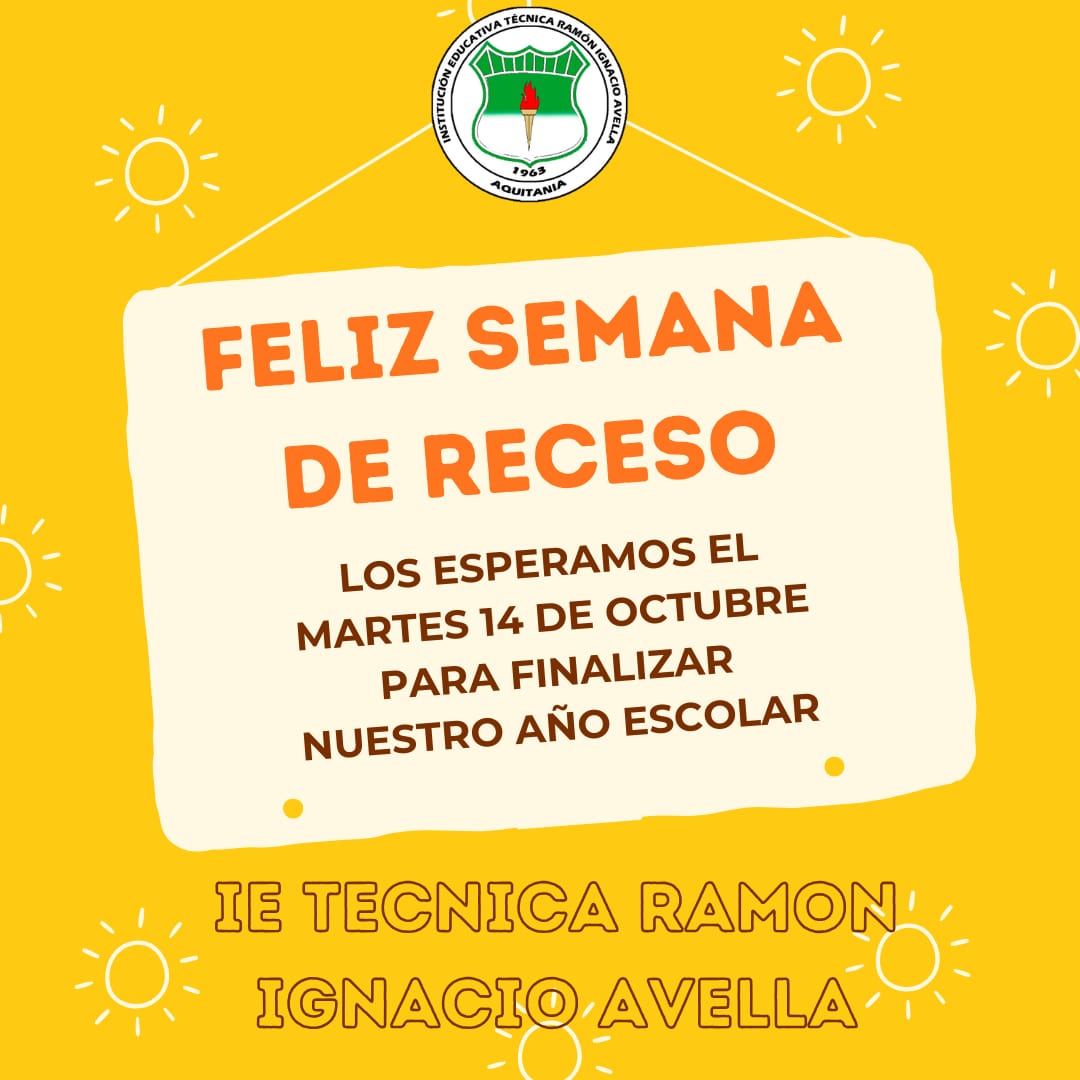 Dando cumplimiento al Decreto 📃1373 de 2007 del Ministerio de Educación Nacional, por el cual se fija una semana de receso en el calendario del segundo semestre del año escolar, les informamos que la semana comprendida entre el 06 y el 13 de octubre de 2025 no habrá clases, retomando labores en horario normal el día martes 14 de octubre de 2025.